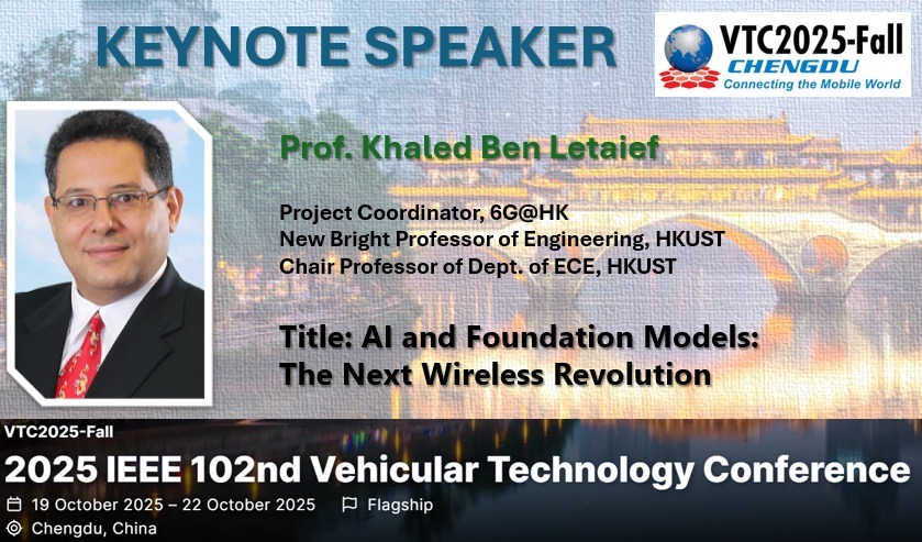 Prof. Khaled Letaief, the Project Coordinator of Hong Kong 6G AoE, delivered the keynote speech with title “AI and Foundation Models: The Next Wireless Revolution” at the 2025 IEEE 102nd Vehicular Technology Conference (VTC2025-Fall) held in Chengdu, China.